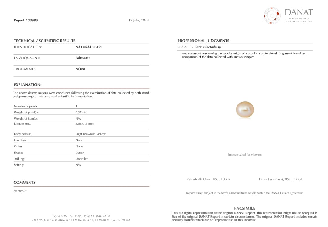 Real Natural Pearl 0.37 Carat Danat Lab Certified 133980/ Hirco Certificate No: 0500072437