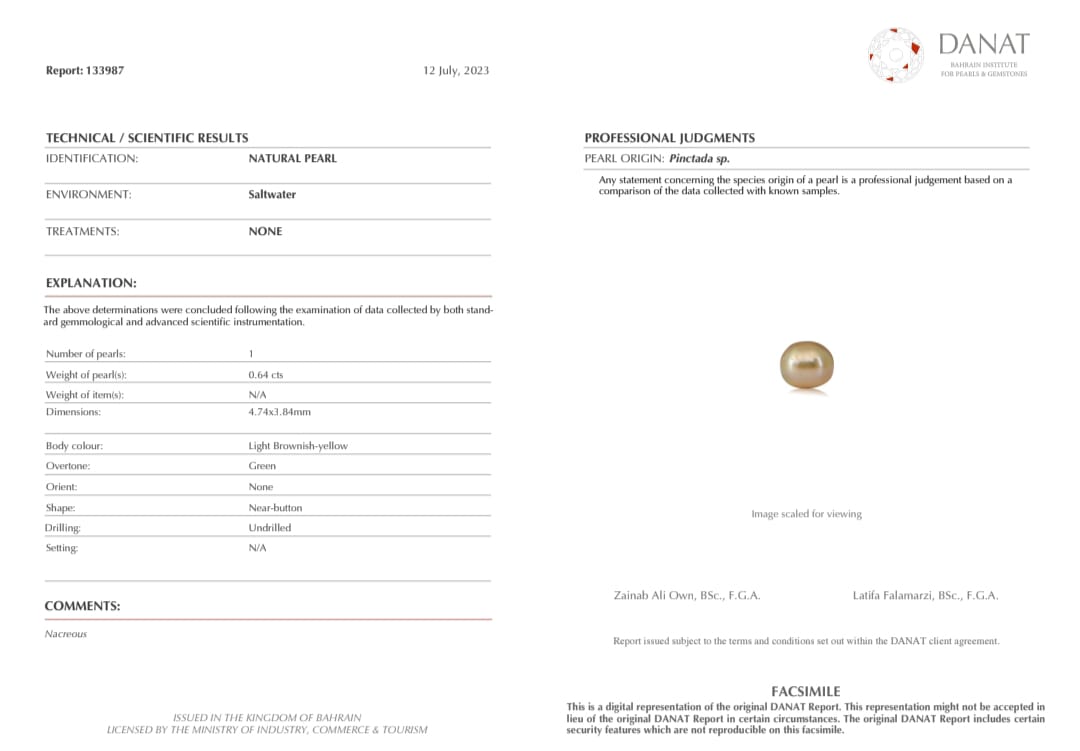 Real Natural Pearl 0.64 Carat Danat Lab Certified 133987/ Hirco Certificate No: 0400012464
