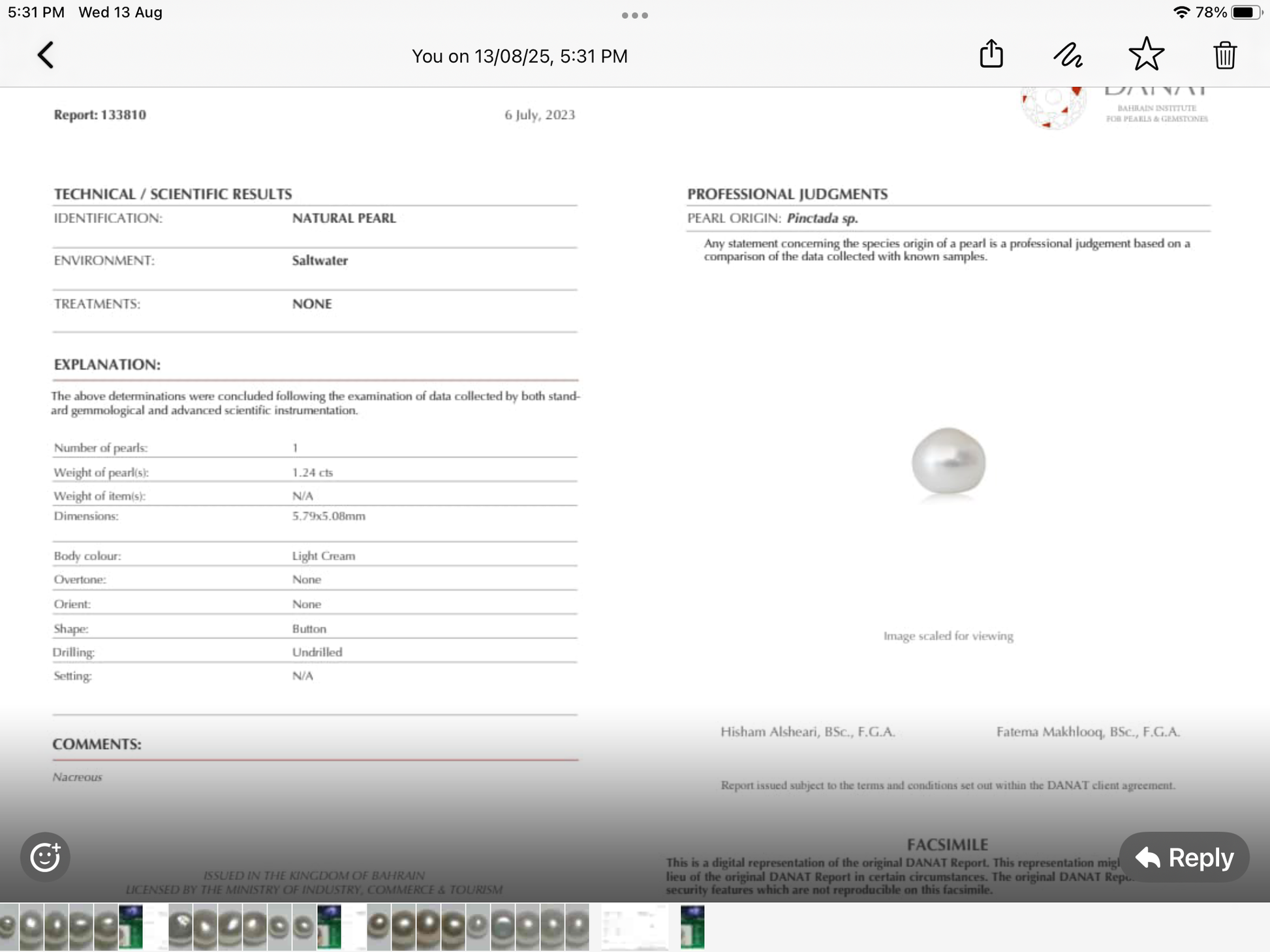 Real Natural Pearl 1.24 Carat Danat Lab Certified 133810/ Hirco Certificate No: 0500102424
