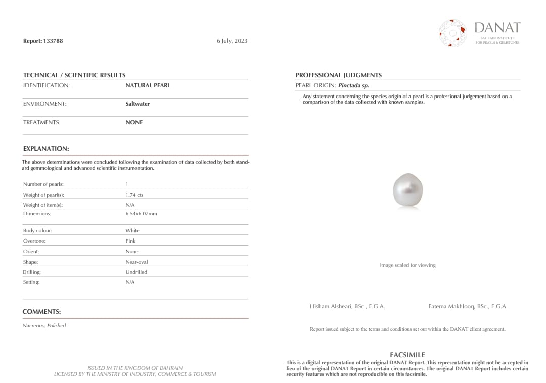 Real Natural Pearl 1.74 Carat Danat Lab Certified 133788/ Hirco Certificate No: 0500172474