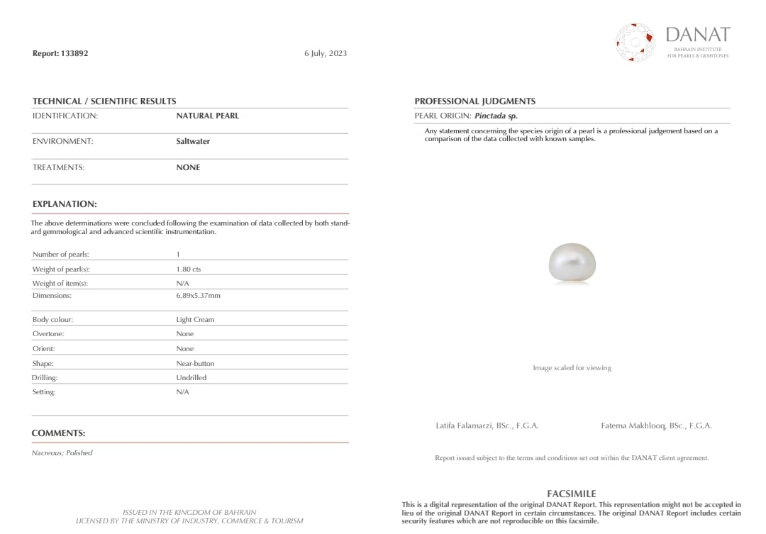 Real Natural Pearl 1.80 Carat Danat Lab Certified 133892/ Hirco Certificate No: 0400062480