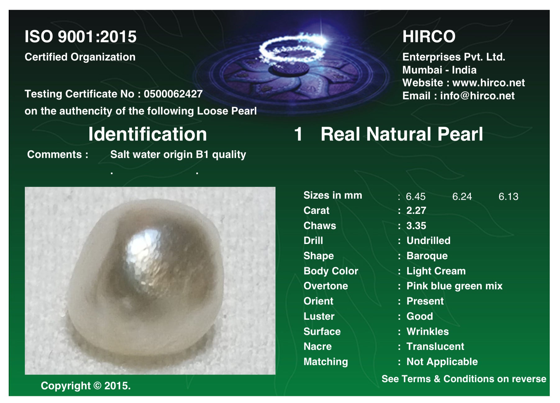 Real Natural Pearl 2.27 Carat Danat Lab Certified 133963/ Hirco Lab Certificate No: 0500062427