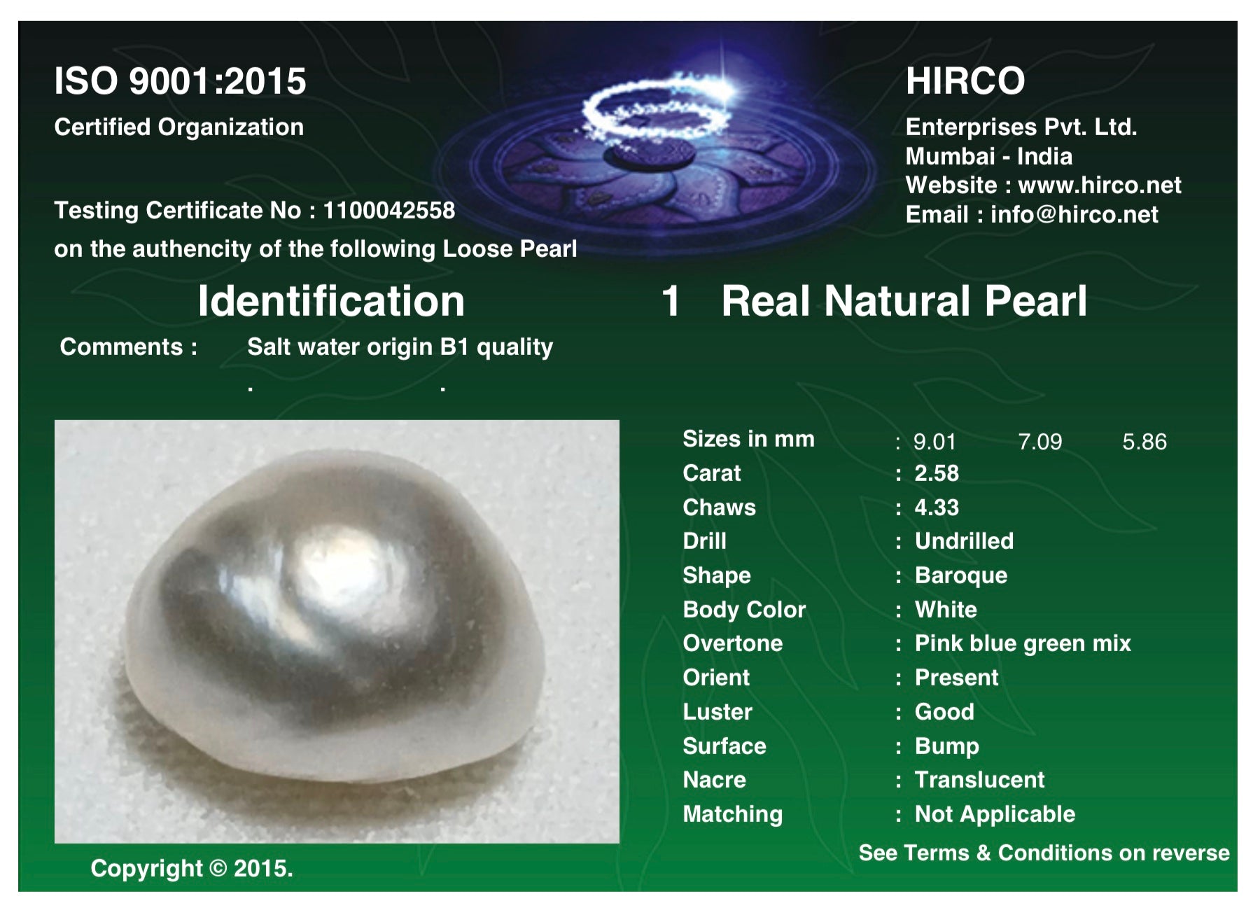 Real Natural Pearl 2.58 Carat Hirco Lab Certificate No: 1100042558
