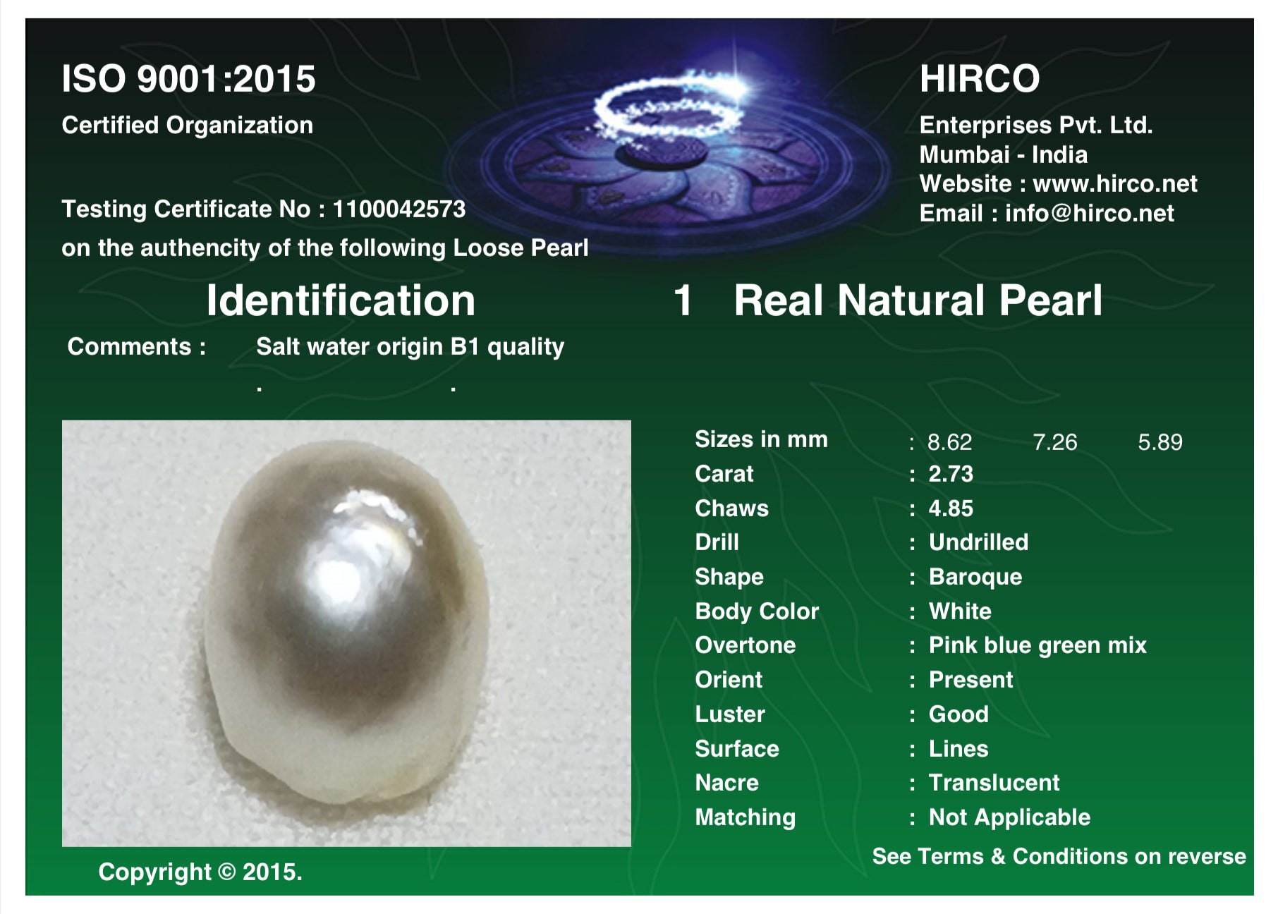Real Natural Pearl 2.73 Carat Hirco Lab Certificate No: 1100042573