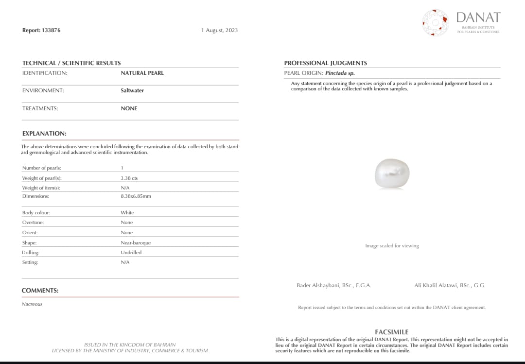 This exquisite natural pearl weighs 3.38 carats and comes with authentic certification from Danat Lab (Certificate No. 133876) and Hirco (Certificate No. 0500052438). Its verified origin and quality ensure a genuine, high-value gem ideal for collectors and connoisseurs seeking a trusted investment in fine pearls.