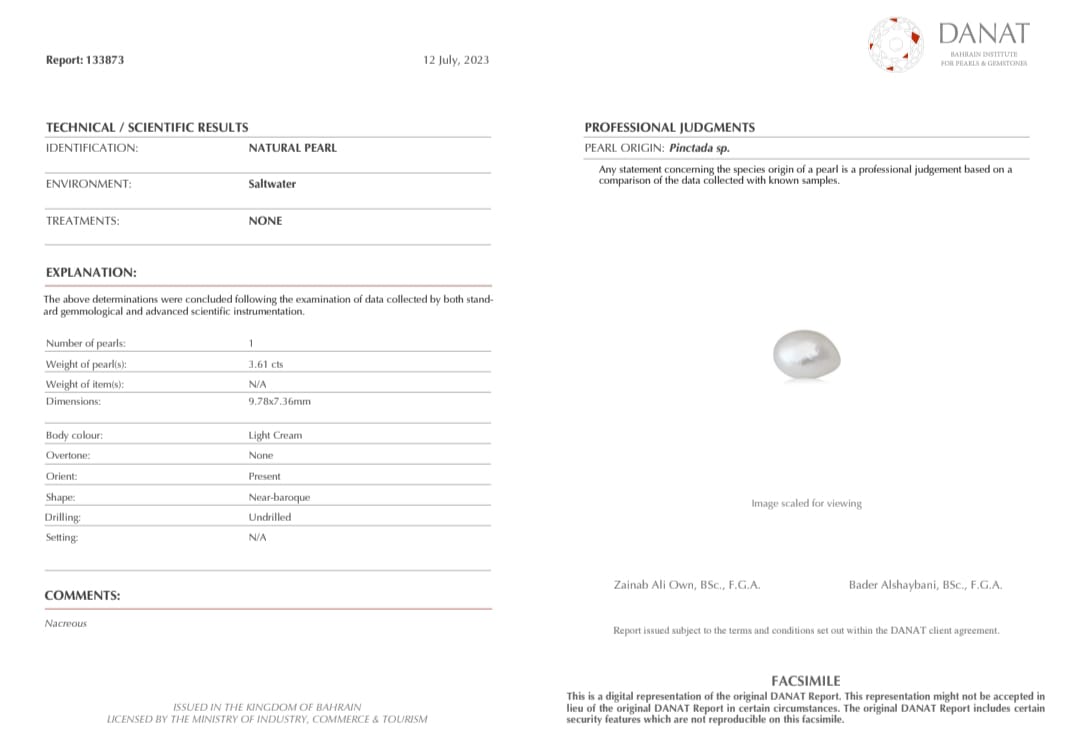 This exquisite natural pearl weighs 3.61 carats and comes with certification from Danat Lab (Certificate No. 133873) and Hirco (Certificate No. 0400202461), ensuring its authenticity and quality. Ideal for collectors and connoisseurs, this pearl offers verified natural origin and superior craftsmanship, making it a valuable addition to any fine jewelry collection.